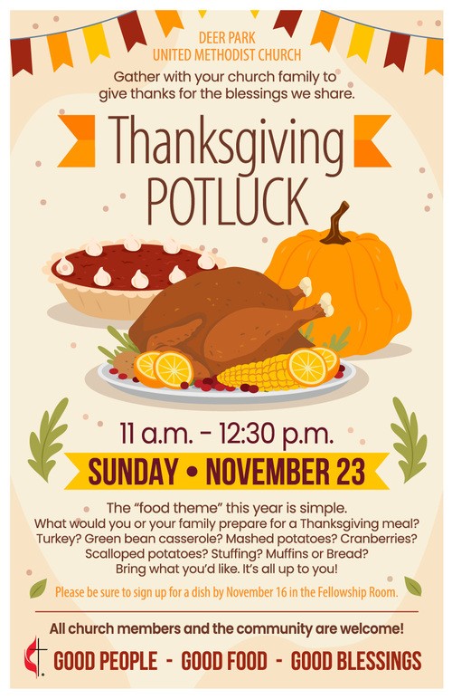 There are many who will go without a nice Thanksgiving meal this season. Please join the Deer Park United Methodist Church in donating food packages so those less fortunate can celebrate in God’s bounty this year. Our goal is to share God’s love in service to our community for at least 30 families this year. Each Thanksgiving meal package is $40.